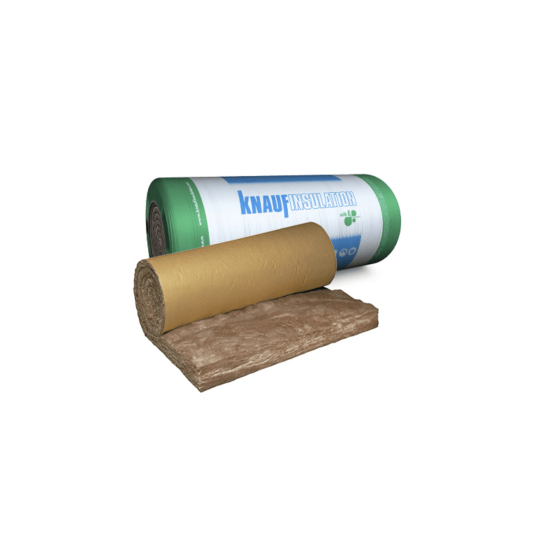 Manta Kraft: Lana mineral de vidrio en formato rollo y revestido por una barrera de vapor en una de sus caras gracias al papel kraft/polietileno del que está construido